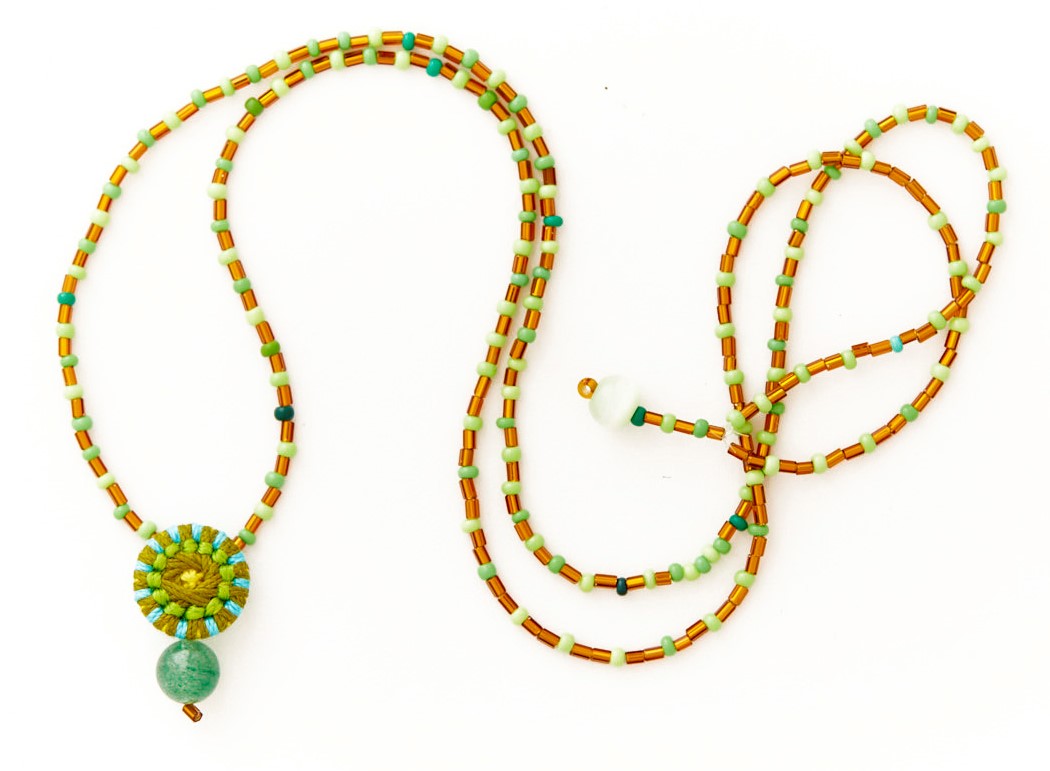 Glasperlenkette mit Kranzknopf und kleiner Jadeperle