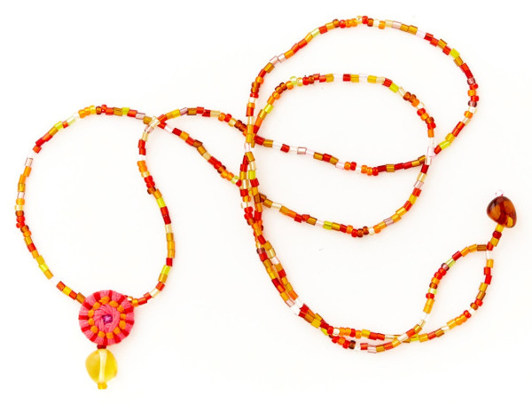 Glasperlenkette mit Kranzknopf und kleinen Bernsteinperlen