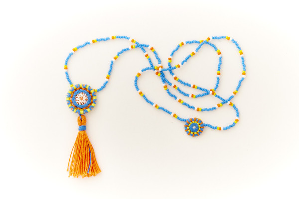 Glasperlenkette mit Posamentenknopfanhängern Gesamtlänge ca. 40 cm Knopfdurchmesser ca. 2,3 cm